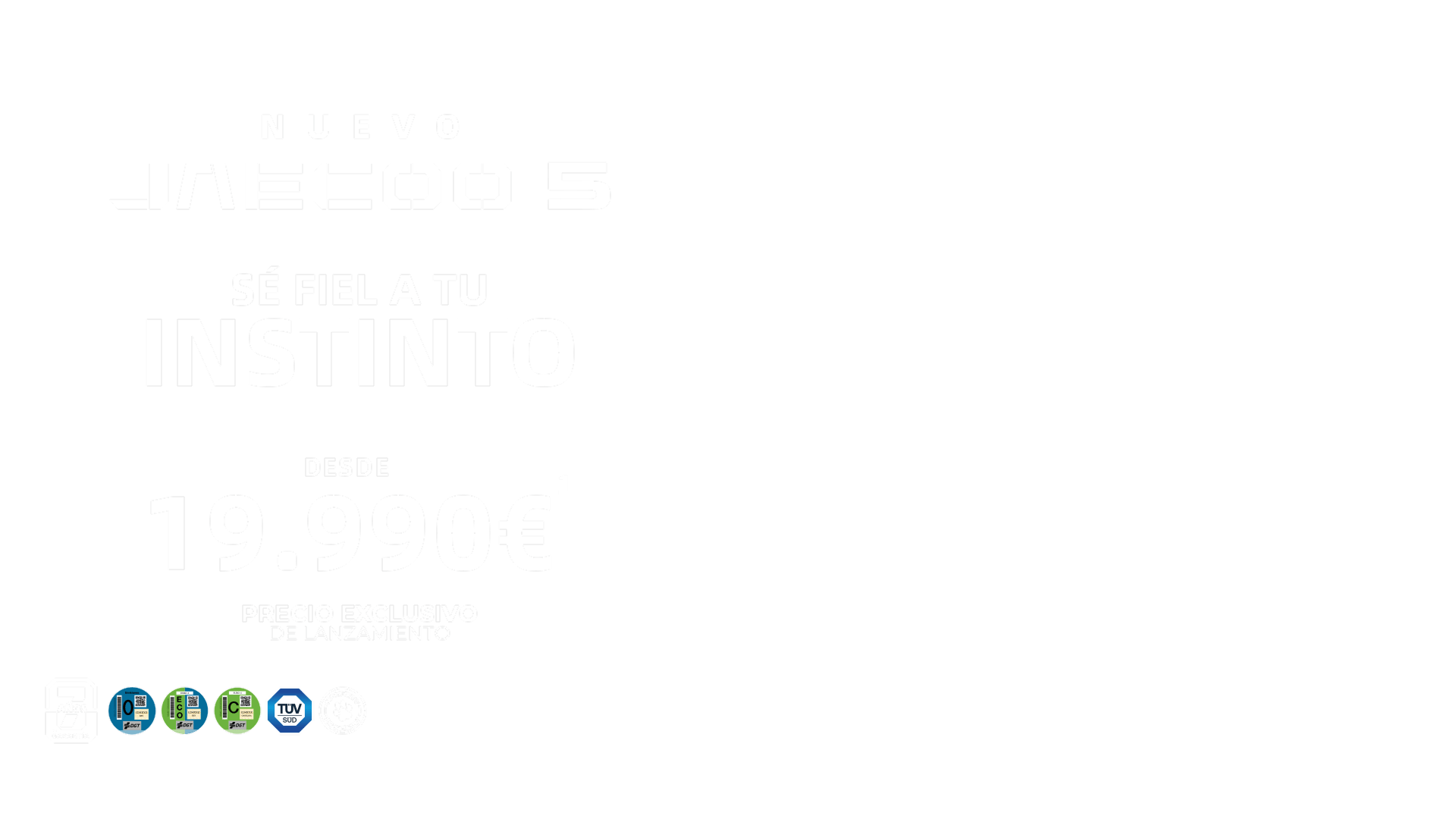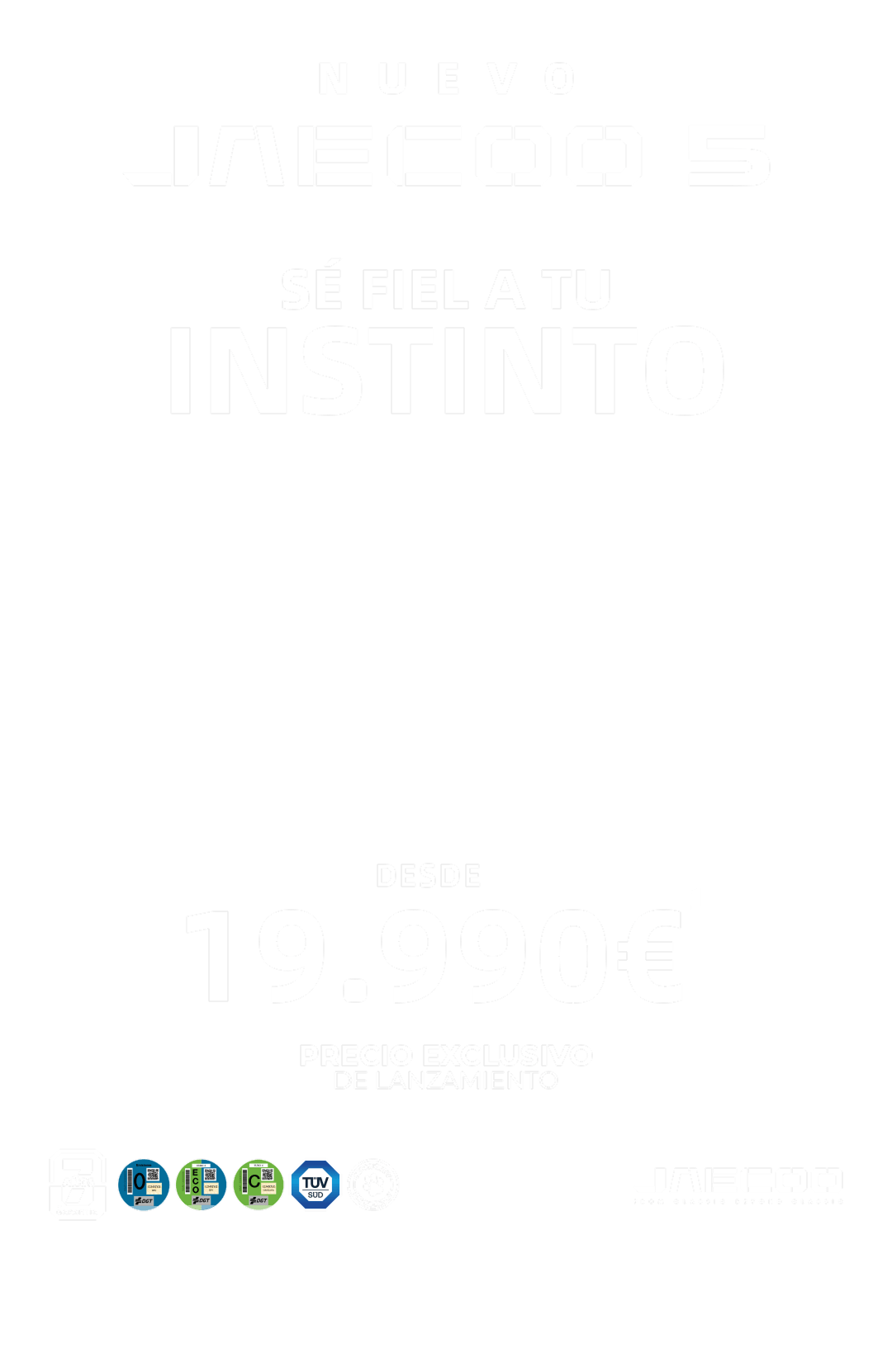 (1) *PVP recomendado en Península y Baleares para Jaecoo 5 Pure 4×2 1.6TDGI 108kW (145cv) (IVA, impuestos de matriculación, transporte, descuento de marca y concesionario, descuento por permuta, descuento por financiar con Santander Consumer Finance S.A., incluidos en la oferta). El vehículo mostrado puede diferir del modelo ofertado. Sistema de amortización Francés. Oferta válida para clientes particulares que financien a través de Santander Consumer Finance, S.A. sujeta a estudio y aprobación según condiciones actuales con un capital mínimo de 16.000€, y con una duración y permanencia mínima de la financiación de 36 meses. Campaña incompatible con otras ofertas financieras. Oferta válida hasta el 31/10/2025. Garantía comercial de 7 años o 150.000 km (lo que ocurra primero), según Manual de Garantías. No incluye gastos de matriculación y pre-entrega. Consumo medio combinado 7.0L/100km (WLTP). Emisiones de CO₂ combinadas: 159/km (WLTP). Para más información consulta en tu Concesionario Oficial JAECOO y en www.jaecoo.es.